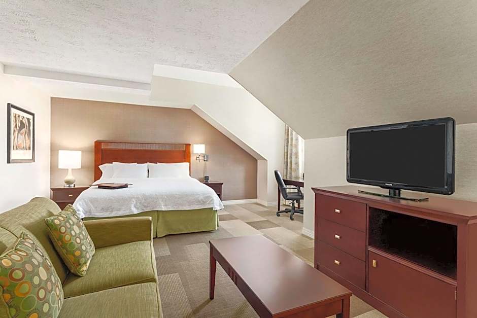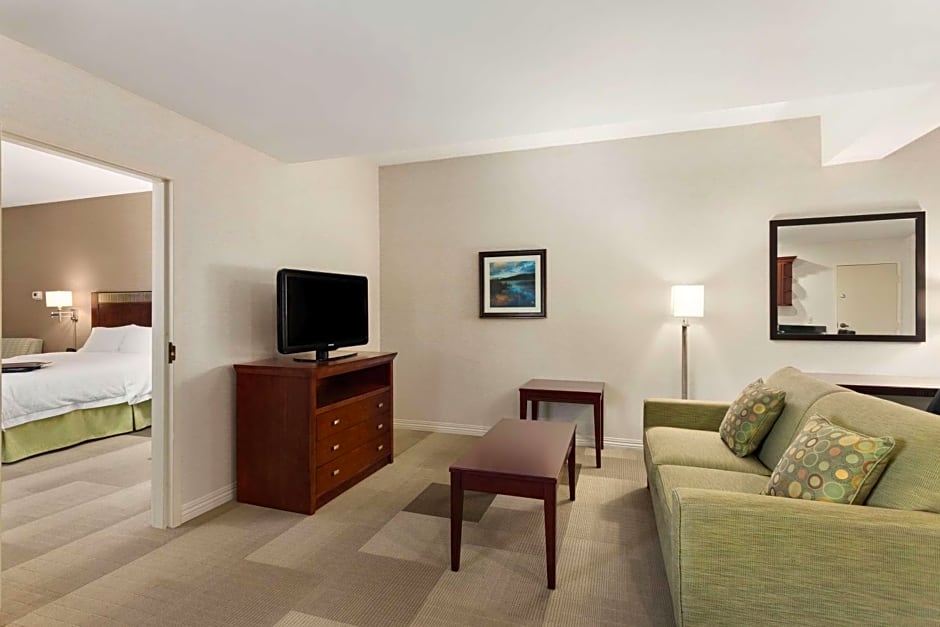 Non-Smoking, Refrigerator, sofa bed, 37-inch LCD TV, free WiFi, work area, tea/coffeemaker Relax in this spacious king suite that features our clean and fresh Hampton bed®. The suite boasts a seating area with a sofa, lounge chairs and a 37-inch LCD TV. There is also a spacious work desk and free WiFi to let you catch up on work while traveling. Feel at home with amenities including a refrigerator, cook top, dishwasher and a tea/coffeemaker. In the bathroom you'll enjoy fluffy towels, a WaterPik® showerhead and curved shower rod for added space and light.